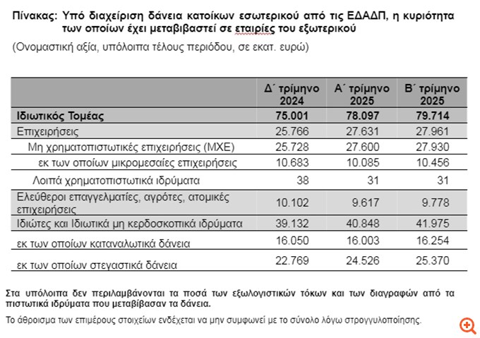 Η συνολική αξία των δανείων αυτής της κατηγορίας αυξήθηκε σε 79.714 εκατ. ευρώ στο τέλος του β΄ τριμήνου του 2025, έναντι 78.097 εκατ. ευρώ το προηγούμενο τρίμηνο.